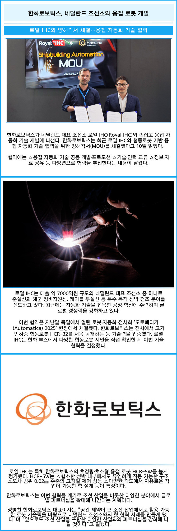 [프라임경제] 한화로보틱스가 네덜란드 대표 조선소 로열 IHC(Royal IHC)와 손잡고 용접 자동화 기술 개발에 나선다. 한화로보틱스는 최근 로열 IHC와 협동로봇 기반 용접 자동화 기술 협력을 위한 양해각서(MOU)를 체결했다고 10일 밝혔다.