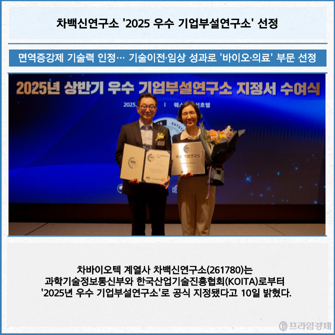 [프라임경제] 차바이오텍 계열사 차백신연구소(261780)는 과학기술정보통신부와 한국산업기술진흥협회(KOITA)로부터 '2025년 우수 기업부설연구소'로 공식 지정됐다고 10일 밝혔다.