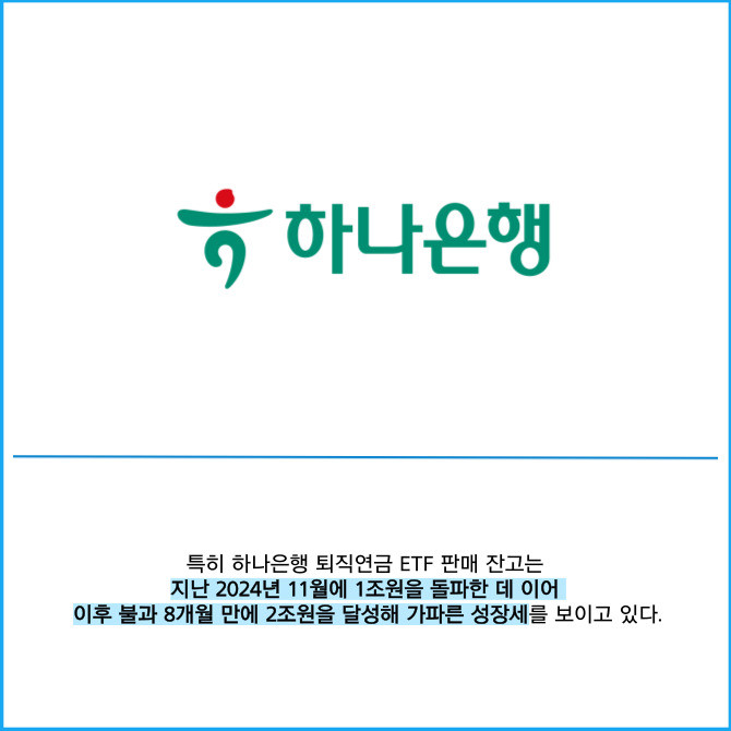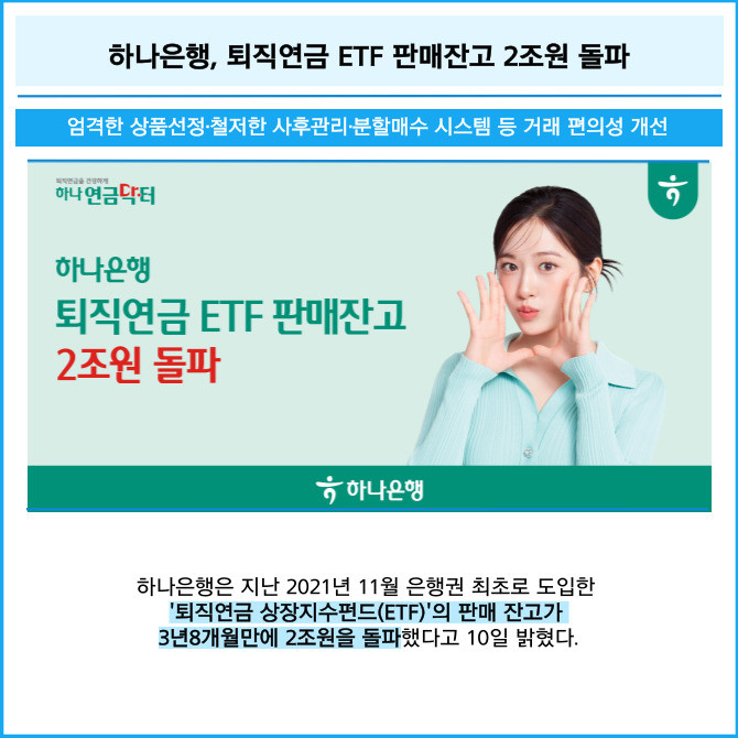 [프라임경제] 하나은행은 지난 2021년 11월 은행권 최초로 도입한 '퇴직연금 상장지수펀드(ETF)'의 판매 잔고가 3년8개월만에 2조원을 돌파했다고 10일 밝혔다.