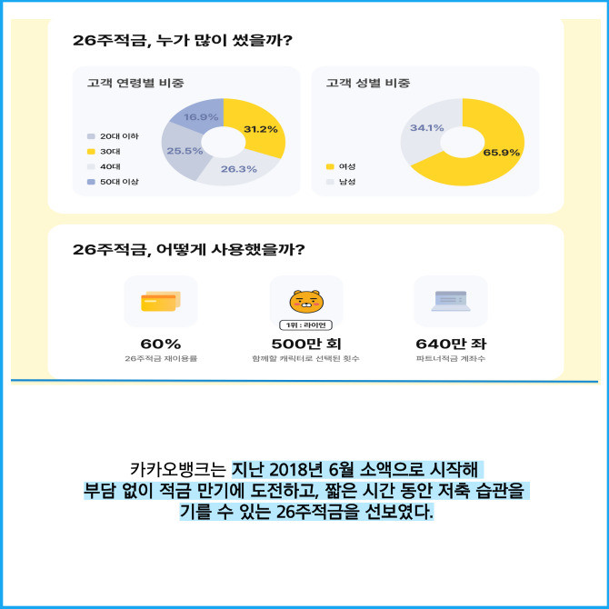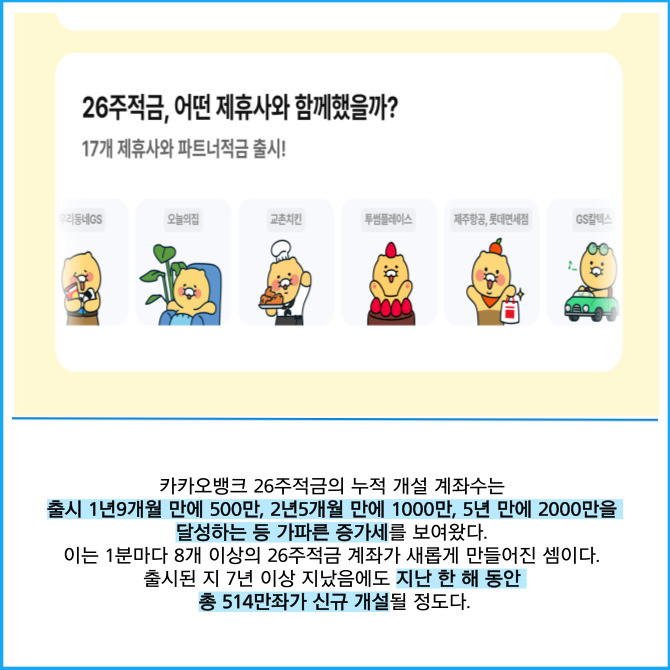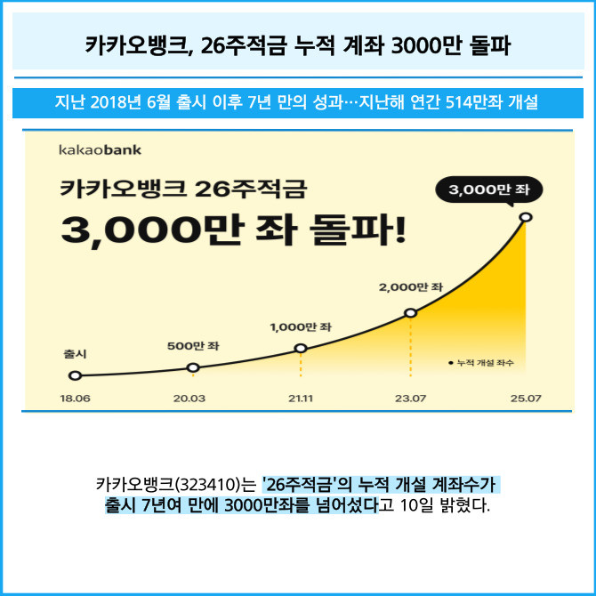 [프라임경제] 카카오뱅크(323410)는 '26주적금'의 누적 개설 계좌수가 출시 7년여 만에 3000만좌를 넘어섰다고 10일 밝혔다.