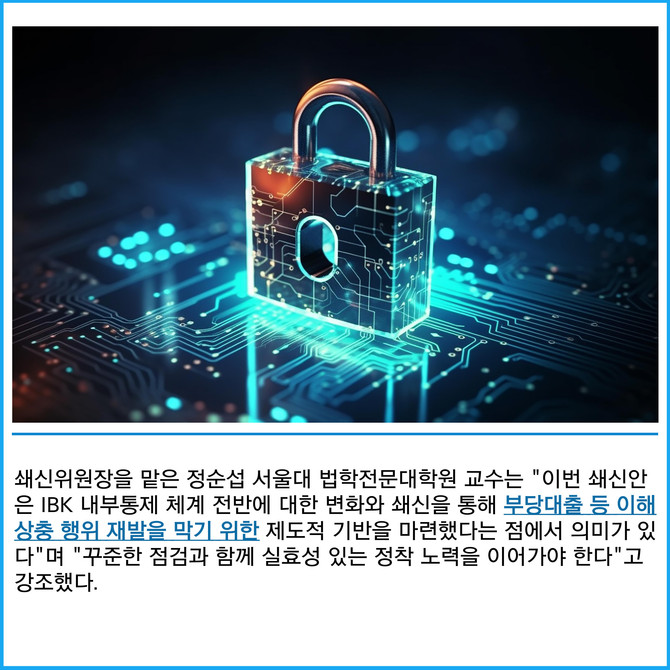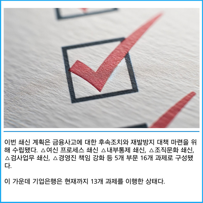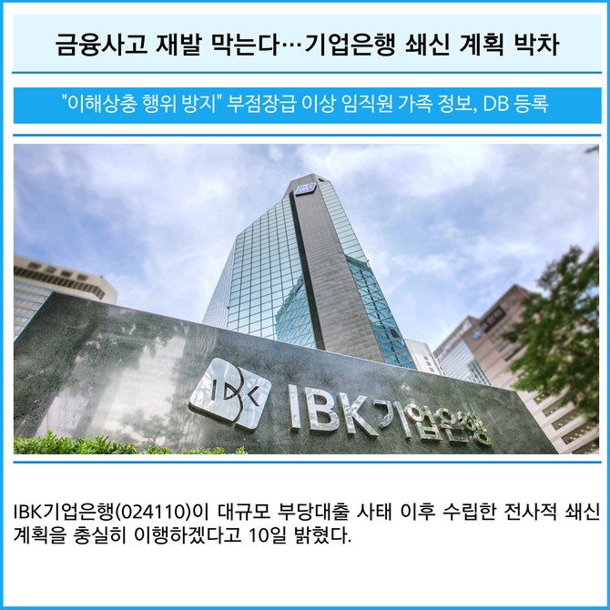 [프라임경제] IBK기업은행(024110)이 대규모 부당대출 사태 이후 수립한 전사적 쇄신 계획을 충실히 이행하겠다고 10일 밝혔다.