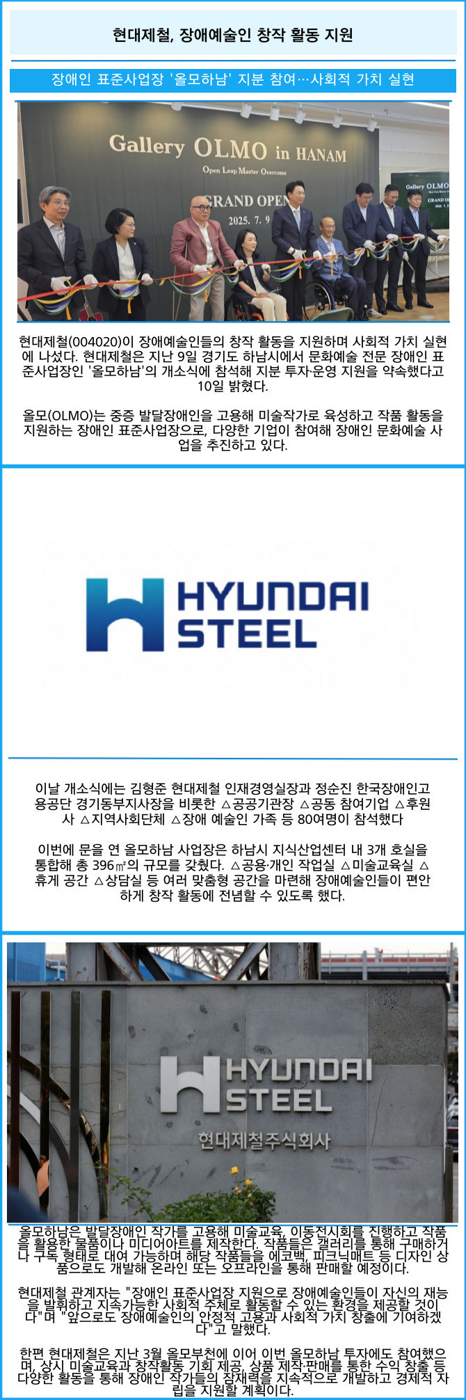 [프라임경제] 현대제철(004020)이 장애예술인들의 창작 활동을 지원하며 사회적 가치 실현에 나섰다. 현대제철은 지난 9일 경기도 하남시에서 문화예술 전문 장애인 표준사업장인 '올모하남'의 개소식에 참석해 지분 투자·운영 지원을 약속했다고 10일 밝혔다.