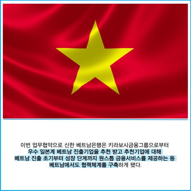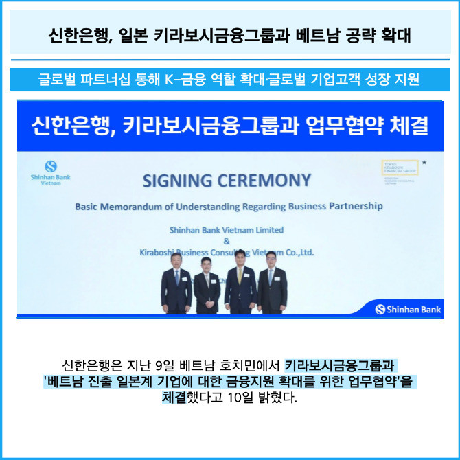 [프라임경제] 신한은행은 지난 9일 베트남 호치민에서 키라보시금융그룹과 '베트남 진출 일본계 기업에 대한 금융지원 확대를 위한 업무협약'을 체결했다고 10일 밝혔다.