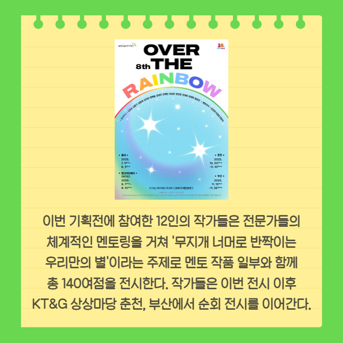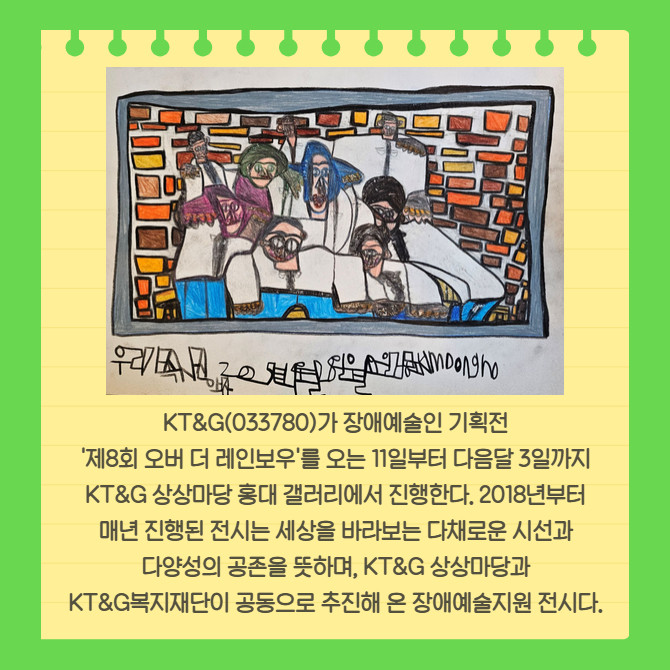 [프라임경제] KT&G(033780)가 장애예술인 기획전 '제8회 오버 더 레인보우'를 오는 11일부터 다음달 3일까지 KT&G 상상마당 홍대 갤러리에서 진행한다. 2018년부터 매년 진행된 전시는 세상을 바라보는 다채로운 시선과 다양성의 공존을 뜻하며, KT&G 상상마당과 KT&G복지재단이 공동으로 추진해 온 장애예술지원 전시다.
