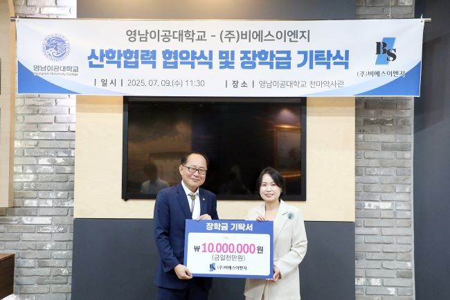 [프라임경제] 영남이공대학교(총장 이재용)는 지난 9일 천마역사관에서 비에스이엔지(대표 조차남)와 산학협력 협약식을 체결하고, 장학금 1000만원 기탁식을 진행했다.