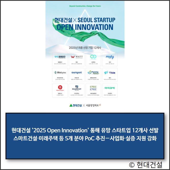 현대건설(000720)이 지난 4일 '2025 현대건설 x Seoul Startup Open Innovation' 공모전을 통해 유망 스타트업 12개사를 최종 선정했다고 10일 밝혔다.