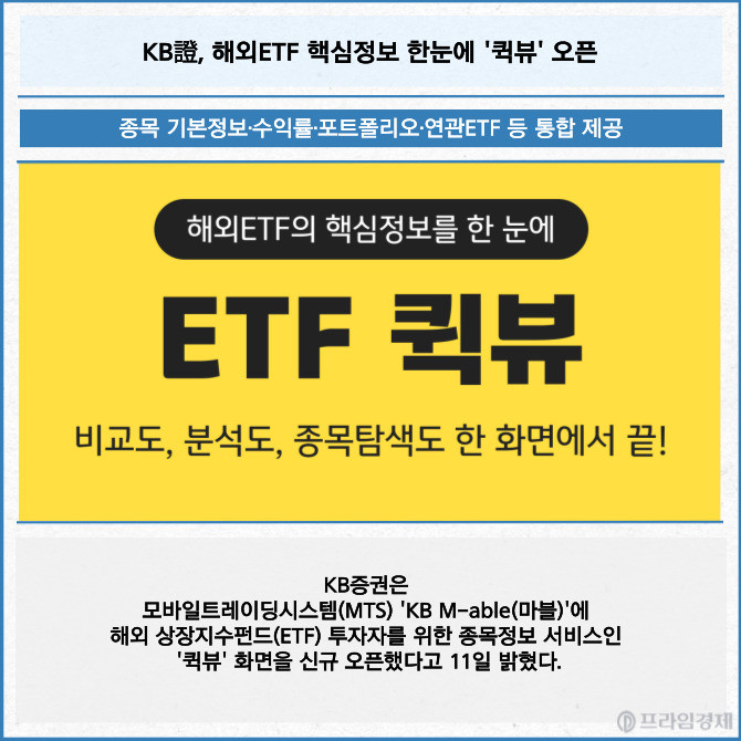 [프라임경제] KB증권은 모바일트레이딩시스템(MTS) 'KB M-able(마블)'에 해외 상장지수펀드(ETF) 투자자를 위한 종목정보 서비스인 '퀵뷰' 화면을 신규 오픈했다고 11일 밝혔다.