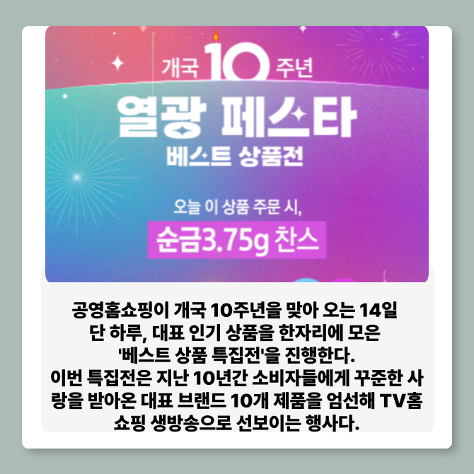 [프라임경제] 공영홈쇼핑이 개국 10주년을 맞아 오는 14일 대표 인기 상품을 한자리에 모은 '베스트 상품 특집전'을 진행한다.