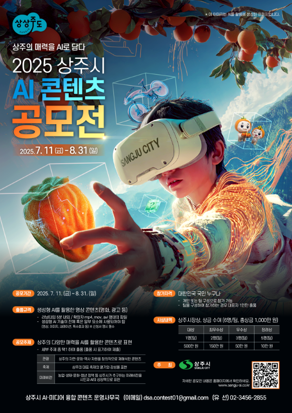 강영석 시장은 "이번 공모전은 시민이 직접 AI 기술을 활용해 상주의 이야기를 새롭게 만들어가는 뜻깊은 자리"이며 "디지털과 창의성이 결합된 콘텐츠가 시정에 활력을 불어넣고, 상주의 매력을 더 많은 이들과 나누는 계기가 되길 기대한다"고 밝혔다.