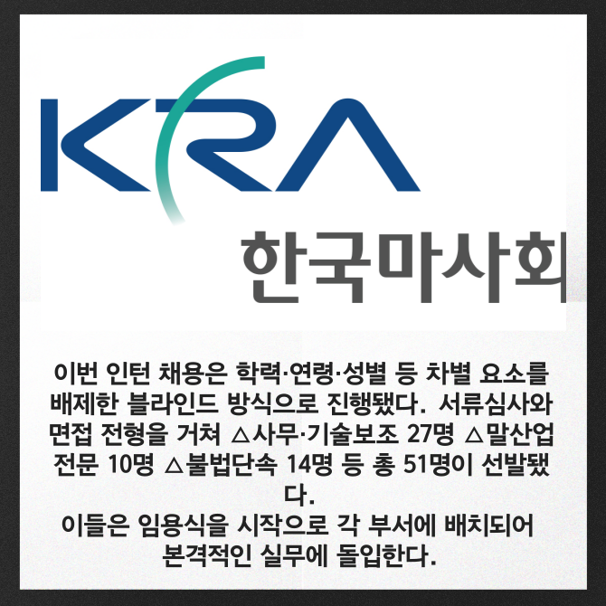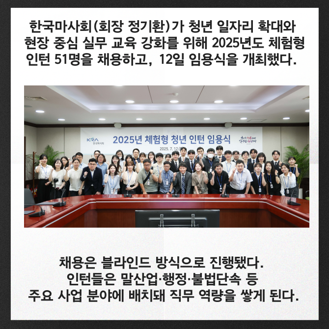 [프라임경제] 한국마사회(회장 정기환)가 청년 일자리 확대와 현장 중심 실무 교육 강화를 위해 2025년도 체험형 인턴 51명의 임용식을 지난 12일 개최했다고 14일 밝혔다.