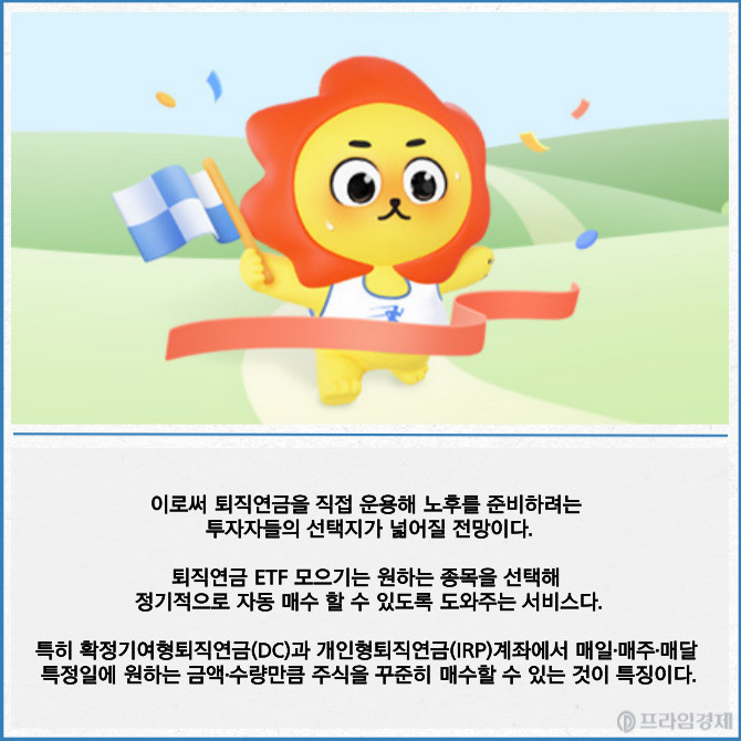 [프라임경제] 삼성증권(016360)은 14일 주식모으기 서비스를 퇴직연금 계좌에서도 이용할 수 있도록 '퇴직연금 상장지수펀드(ETF) 모으기' 서비스를 오픈했다.