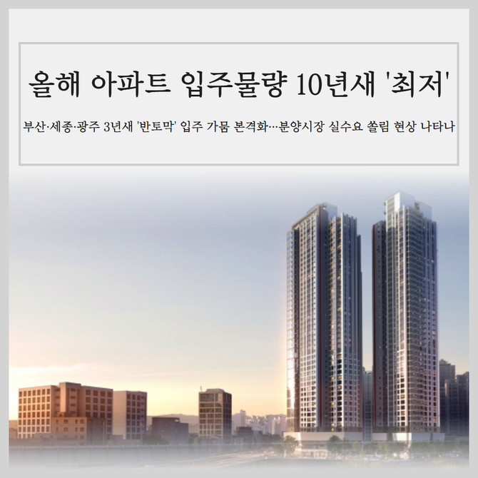 [프라임경제] 올해 전국 아파트 입주 물량이 최근 10년간 가장 적은 수준으로 떨어질 전망이다. 2022년부터 시작된 부동산 경기 침체로 분양이 위축된 여파로, 올해부터 새 아파트 품귀 현상이 본격화될 수 있다는 분석이다.