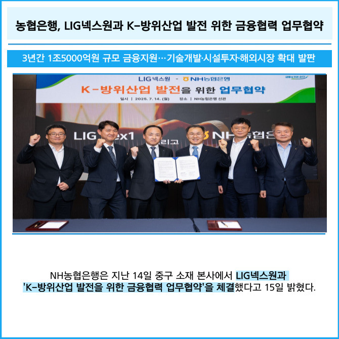 [프라임경제] NH농협은행은 지난 14일 중구 소재 본사에서 LIG넥스원과 'K-방위산업 발전을 위한 금융협력 업무협약'을 체결했다고 15일 밝혔다.
