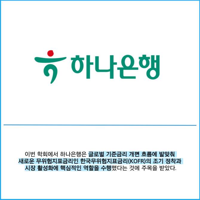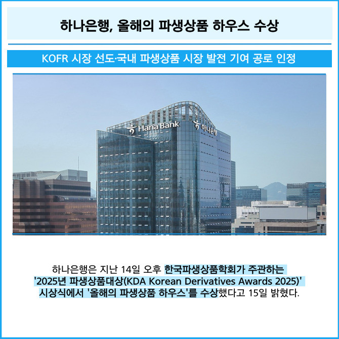 [프라임경제] 하나은행은 지난 14일 오후 한국파생상품학회가 주관하는 '2025년 파생상품대상(KDA Korean Derivatives Awards 2025)' 시상식에서 '올해의 파생상품 하우스'를 수상했다고 15일 밝혔다.