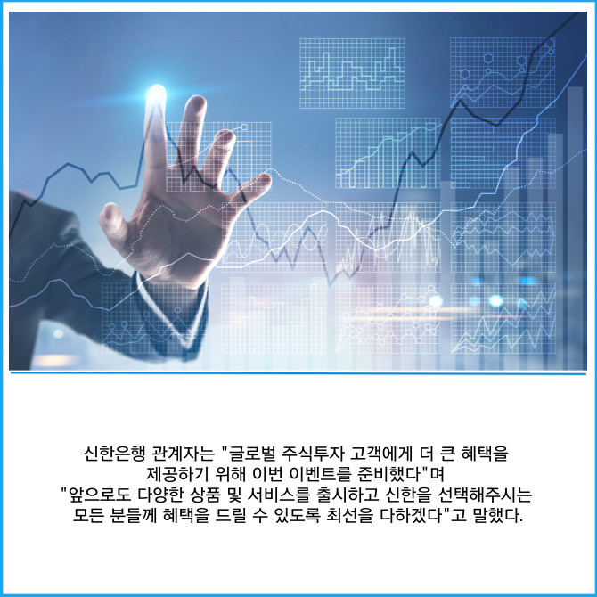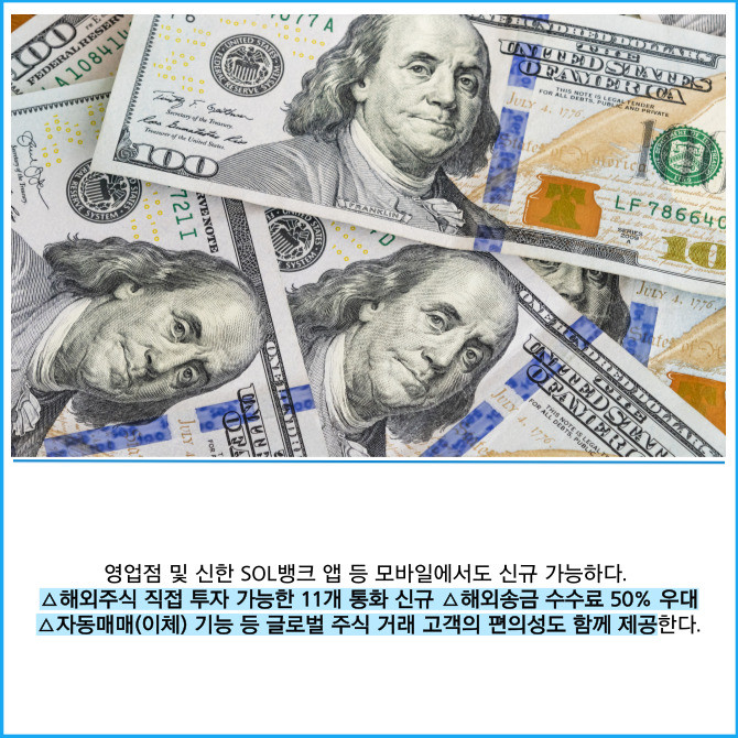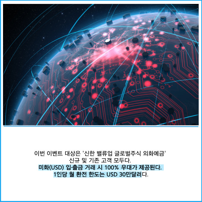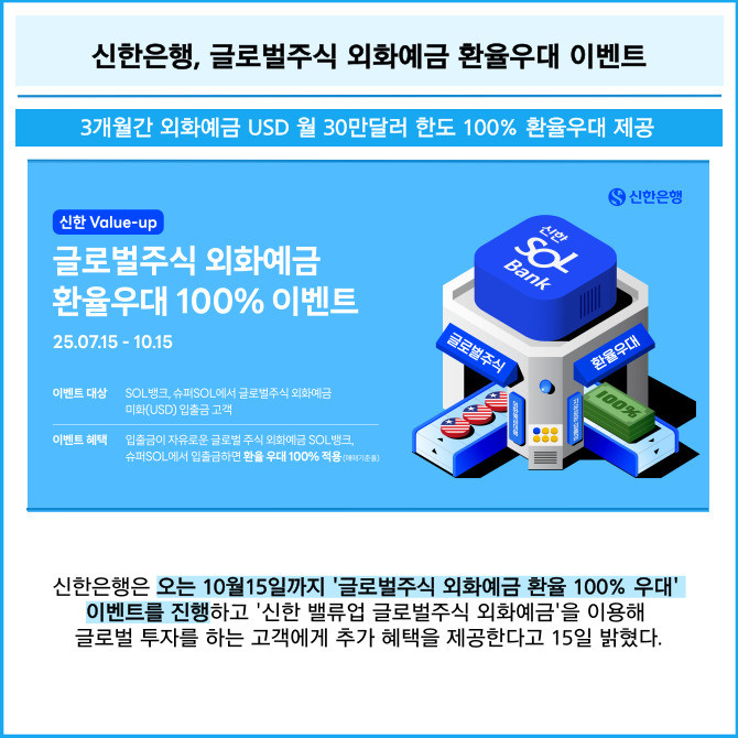 [프라임경제] 신한은행은 오는 10월15일까지 '글로벌주식 외화예금 환율 100% 우대' 이벤트를 진행하고 '신한 밸류업 글로벌주식 외화예금'을 이용해 글로벌 투자를 하는 고객에게 추가 혜택을 제공한다고 15일 밝혔다.