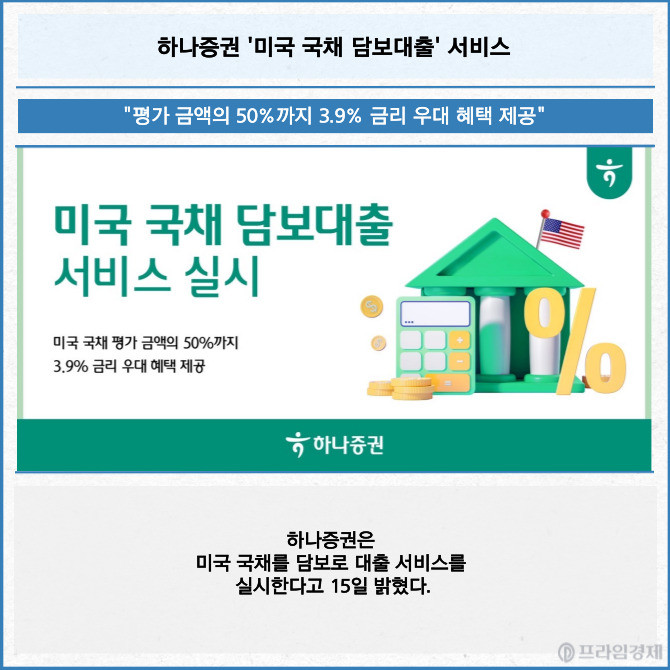 [프라임경제] 하나증권은 미국 국채를 담보로 대출 서비스를 실시한다고 15일 밝혔다.