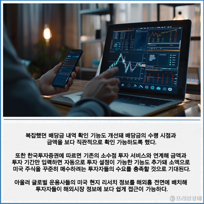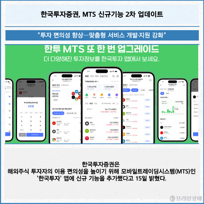 [프라임경제] 한국투자증권은 해외주식 투자자의 이용 편의성을 높이기 위해 모바일트레이딩시스템(MTS)인 '한국투자' 앱에 신규 기능을 추가했다고 15일 밝혔다.