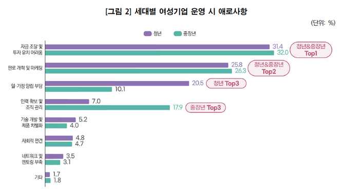 '남성 대비 불리한 점'에 대해서는 세대별 인식 차이가 두드러졌다. 청년층 여성기업은 '일·가정 양립 부담'을 가장 큰 어려움으로 꼽았다. 중장년층은 '남성 위주 네트워크 운영으로 인한 여성 참여 제한'을 가장 많이 응답했다.