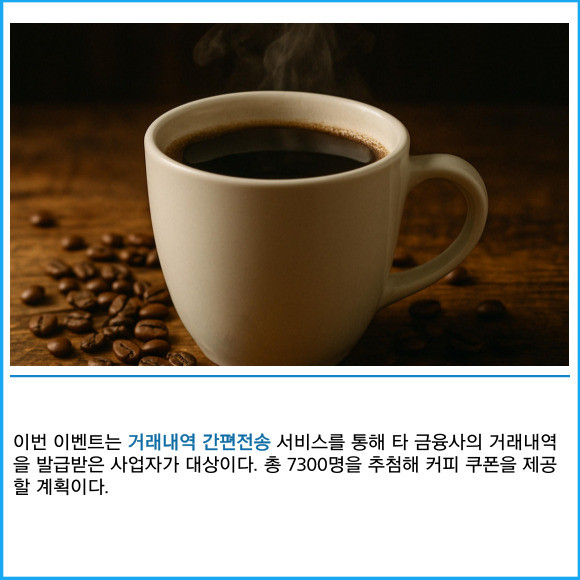 [프라임경제] 하나은행이 7월 부가가치세 신고 기간을 맞아 오는 31일까지 '거래내역 간편전송' 커피 쿠폰 이벤트를 실시한다고 15일 밝혔다.