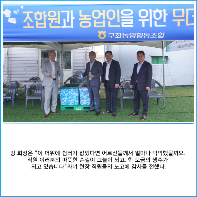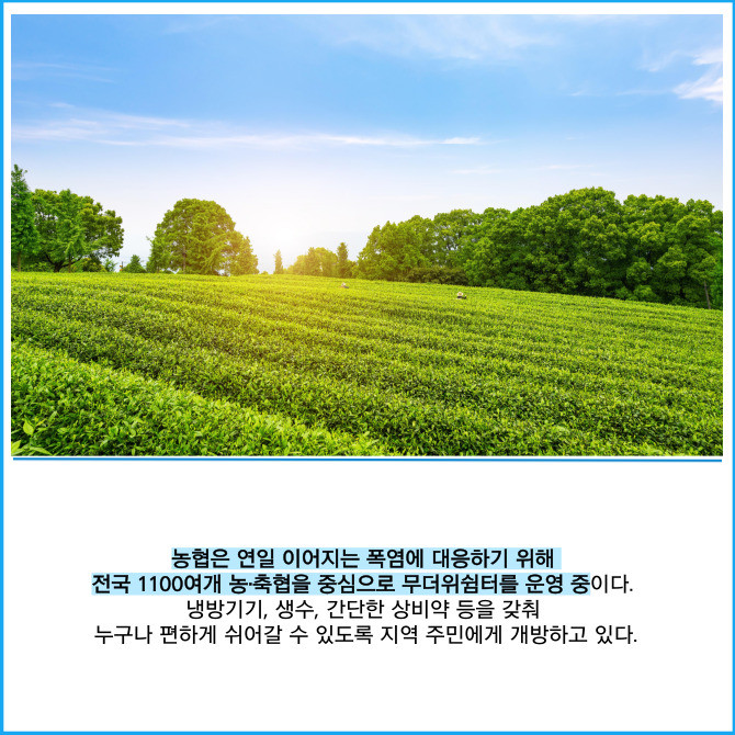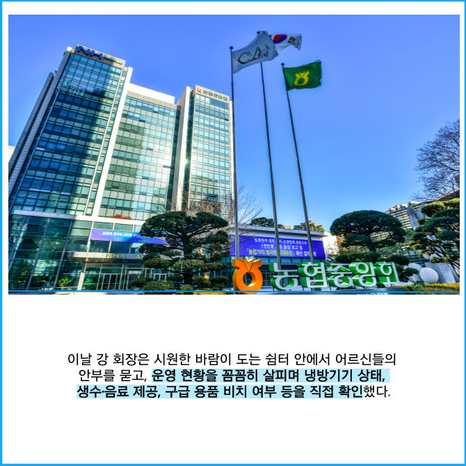 [프라임경제] 농협중앙회는 강호동 회장이 제주 지역을 찾아 지역 농·축협이 운영 중인 무더위쉼터를 방문해 무더위 속 쉼터를 찾은 어르신들과 일일이 인사를 나누고 쉼터 운영에 힘쓰는 현장 직원들을 따뜻하게 격려했다고 15일 밝혔다.