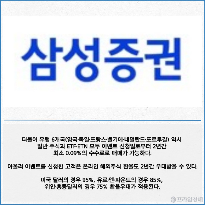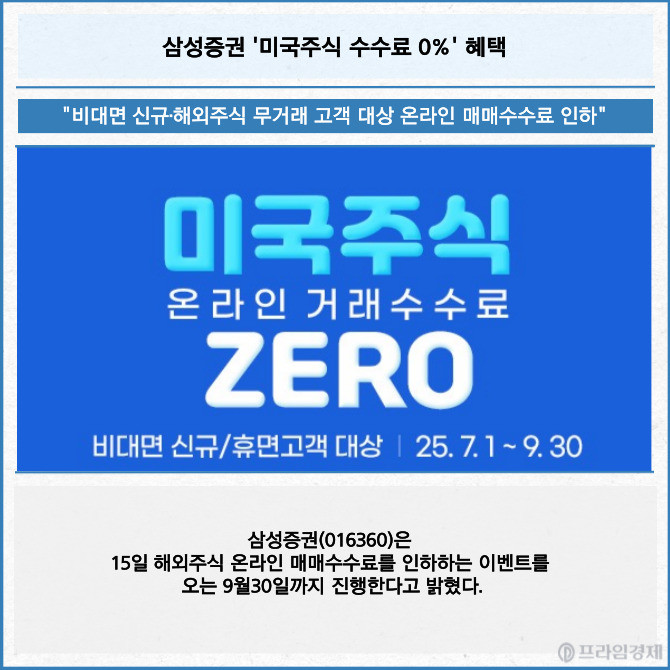 [프라임경제] 삼성증권(016360)은 15일 해외주식 온라인 매매수수료를 인하하는 이벤트를 오는 9월30일까지 진행한다고 밝혔다.