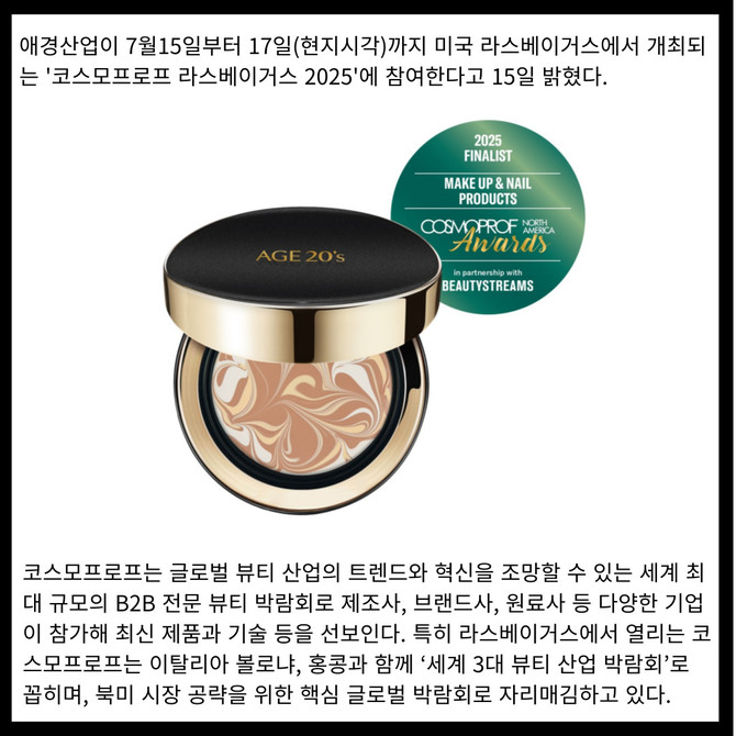 [프라임경제] 애경산업이 7월15일부터 17일(현지시각)까지 미국 라스베이거스에서 개최되는 '코스모프로프 라스베이거스 2025'에 참여한다고 15일 밝혔다.