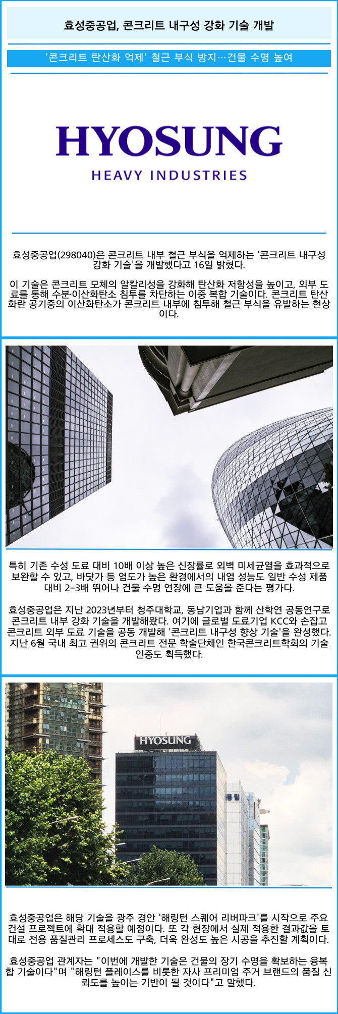 [프라임경제] 효성중공업(298040)은 콘크리트 내부 철근 부식을 억제하는 '콘크리트 내구성 강화 기술'을 개발했다고 16일 밝혔다.