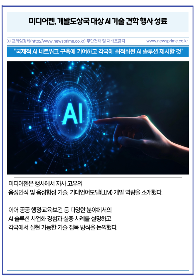 [프라임경제] 음성·생성형 인공지능(AI) 전문기업 미디어젠(279600)이 지난 15일 서울시 마곡 R&D센터에서 개발도상국 공공분야 관계자들을 초청해 AI 기술 견학 및 교류 행사를 성공적으로 마무리했다고 16일 밝혔다.