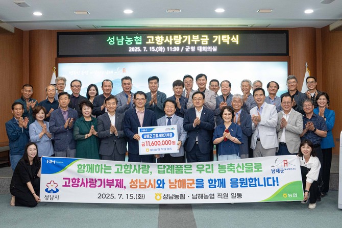 남해군은 지난 15일 성남농협 임직원들이 한마음으로 모은 고향사랑기부금 1160만원을 기탁했다고 16일 밝혔다.