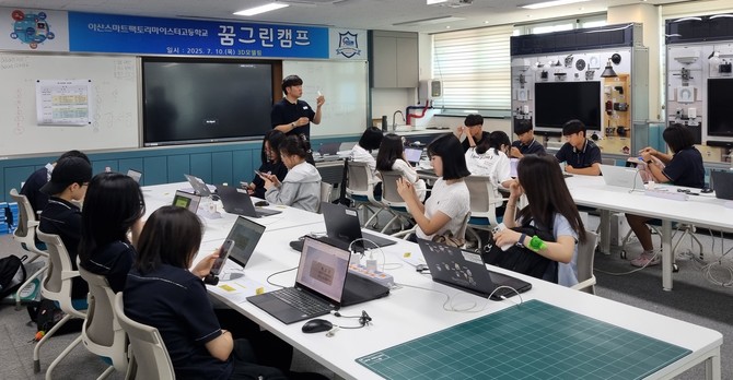 아산스마트팩토리마이스터고등학교(교장 조동헌, 이하 아스마고)는 지난 10일 오전10시~오후 3시 아스마고 실습장 및 시청각실에서 천안 관내 중학교 18개교 84명, 아산 관내 중학교 13개교 67명, 평택 관내 중학교 3개교 9명, 총34개교 160명을 대상으로 2025년 꿈그린 캠프를 개최했다.