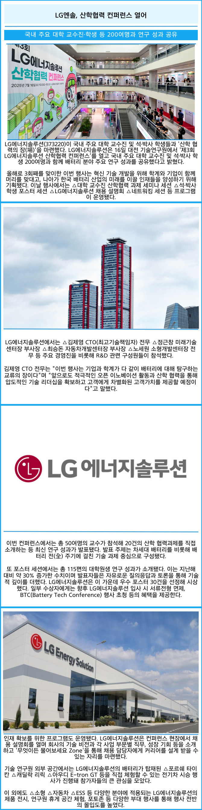[프라임경제] LG에너지솔루션(373220)이 국내 주요 대학 교수진 및 석·박사 학생들과 '산학 협력의 장(場)'을 마련했다. LG에너지솔루션은 16일 대전 기술연구원에서 '제3회 LG에너지솔루션 산학협력 컨퍼런스'를 열고 국내 주요 대학 교수진 및 석·박사 학생 200여명과 함께 배터리 분야 주요 연구 성과를 공유했다고 밝혔다.