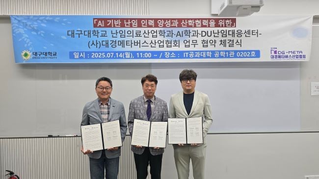 대구대학교 난임의료산업학과(학과장 구덕본), AI학과(학과장 정규만), DU난임대응센터(센터장 구덕본)는 지난 14일 IT공과대학 공학1호관에서 대경메타버스산업협회(회장 백재성)와 '난임 인구를 위한 메타버스 플랫폼 공동 개발'을 위한 업무협약을 체결했다.