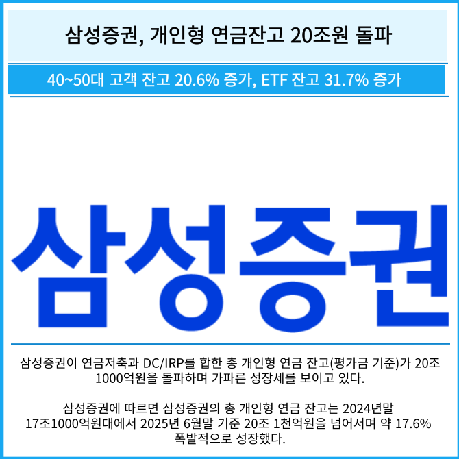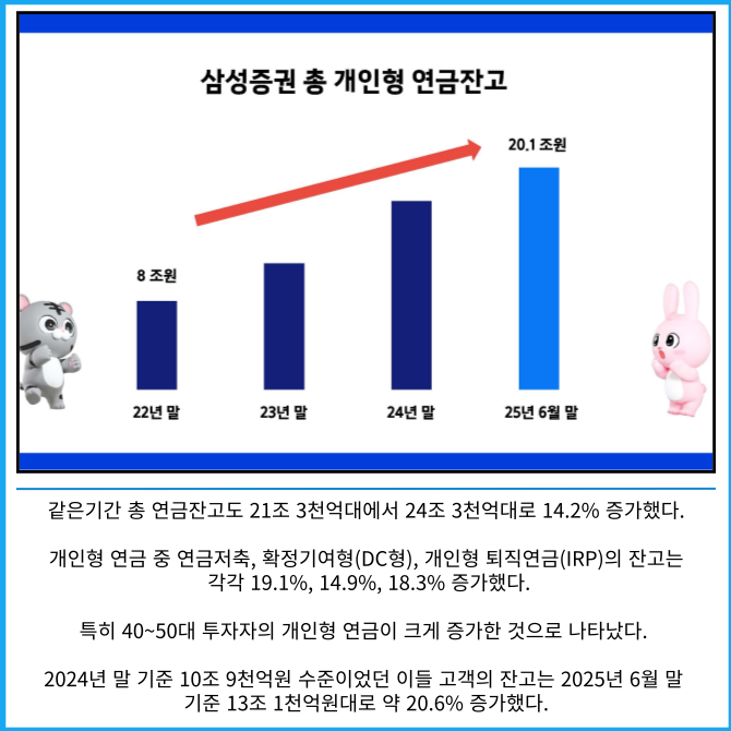 삼성증권에 따르면 삼성증권의 총 개인형 연금 잔고는 2024년말 17조 1천억원대에서 2025년 6월말 기준 20조 1천억원을 넘어서며 약 17.6% 폭발적으로 성장했다. 같은기간 총 연금잔고도 21조 3천억대에서 24조 3천억대로 14.2% 증가했다.
