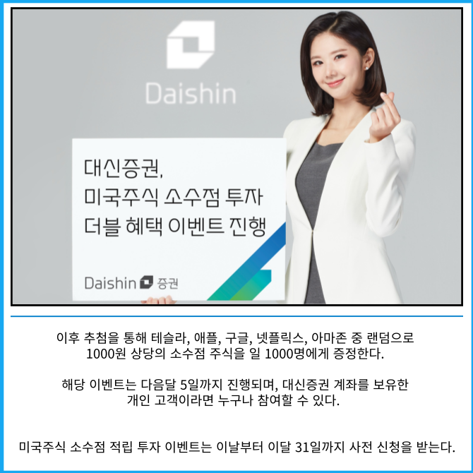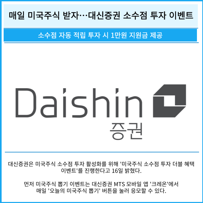 [프라임경제] 대신증권(003540)은 미국주식 소수점 투자 활성화를 위해 '미국주식 소수점 투자 더블 혜택 이벤트'를 진행한다고 16일 밝혔다.