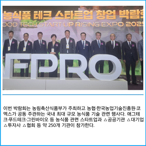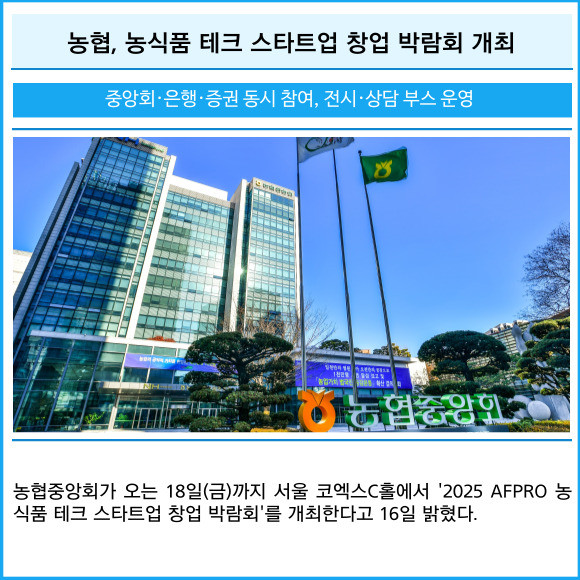 [프라임경제] 농협중앙회가 오는 18일(금)까지 서울 코엑스C홀에서 '2025 AFPRO 농식품 테크 스타트업 창업 박람회'를 개최한다고 16일 밝혔다.