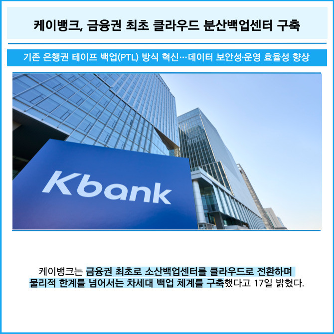 [프라임경제] 케이뱅크는 금융권 최초로 소산백업센터를 클라우드로 전환하며 물리적 한계를 넘어서는 차세대 백업 체계를 구축했다고 17일 밝혔다.