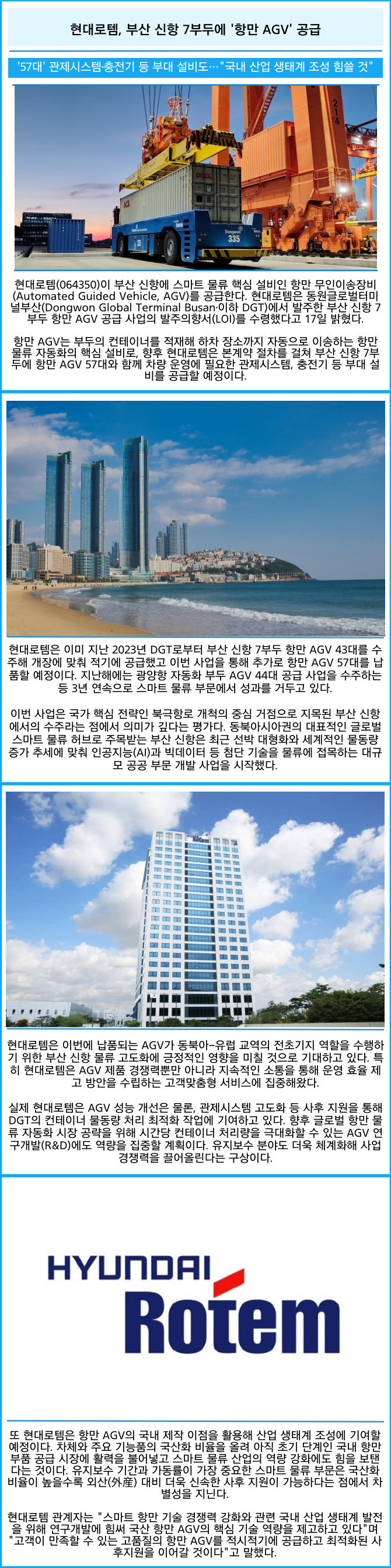 [프라임경제] 현대로템(064350)이 부산 신항에 스마트 물류 핵심 설비인 항만 무인이송장비(Automated Guided Vehicle, AGV)를 공급한다. 현대로템은 동원글로벌터미널부산(Dongwon Global Terminal Busan·이하 DGT)에서 발주한 부산 신항 7부두 항만 AGV 공급 사업의 발주의향서(LOI)를 수령했다고 17일 밝혔다.