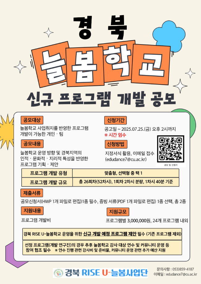 경북형 늘봄학교 콘텐츠 개발에 관심 있는 지역 전문가라면 누구나 참여할 수 있으며, 세부 내용과 접수 방법은 경북 RISE U-늘봄 공식 홈페이지에서 확인할 수 있다.