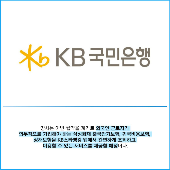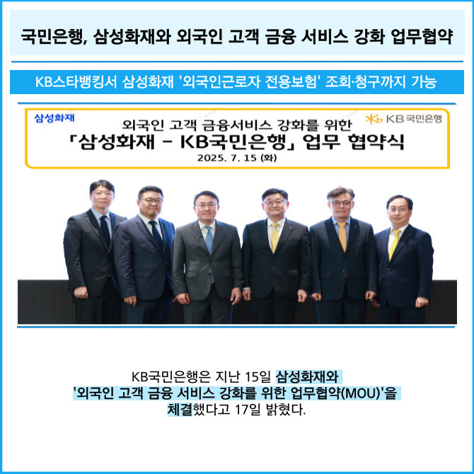 [프라임경제] KB국민은행은 지난 15일 삼성화재와 '외국인 고객 금융 서비스 강화를 위한 업무협약(MOU)'을 체결했다고 17일 밝혔다.