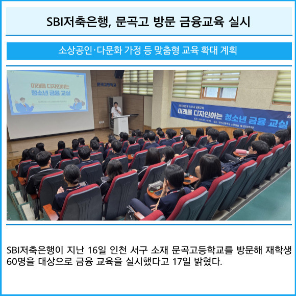 [프라임경제] SBI저축은행이 지난 16일 인천 서구 소재 문곡고등학교를 방문해 재학생 60명을 대상으로 금융교육을 실시했다고 17일 밝혔다.