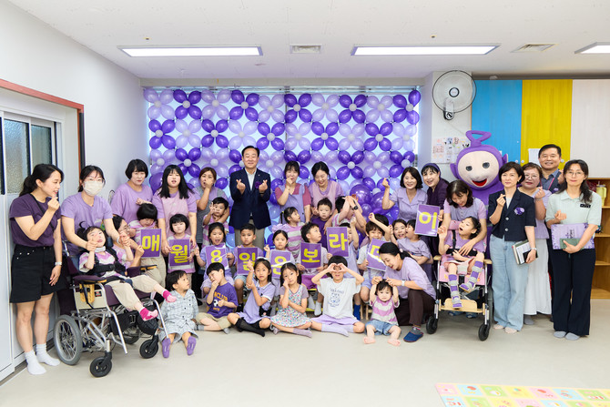 이날 오전 아이원어린이집(용남면 소재)에서 죽림어린이집과 아이원어린이 원아, 학부모, 교사 등 40여 명과 함께 보라색 소품이나 옷 착용, 보라색을 활용한 그림 그리기 활동, 보라색 포토존 촬영 등으로 쉽고 재미있는 보라데이 교육 프로그램을 진행해 보호와 존중의 의미를 공유했다.