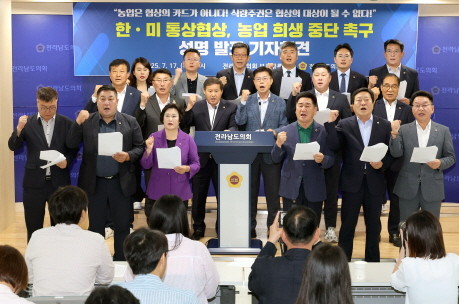[프라임경제] 전라남도의회는 17일, 브리핑룸에서 최근 한미 통상협상과 관련해 농업 분야가 다시금 협상의 희생양이 되는 것을 강력히 반대하며, 향후 통상협상 과정에서 우리 농업을 굳건히 지킬 것을 촉구하는 성명서를 발표했다.