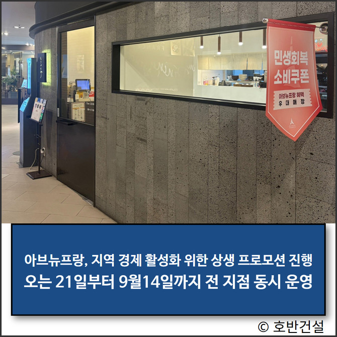 호반그룹의 호반프라퍼티가 운영하는 아브뉴프랑이 민생회복 소비쿠폰 이용 고객을 위한 프로모션을 실시한다고 17일 밝혔다. 이번 프로모션은 아브뉴프랑 판교, 광교, 광명 3개 지점에서 동시 운영된다.
