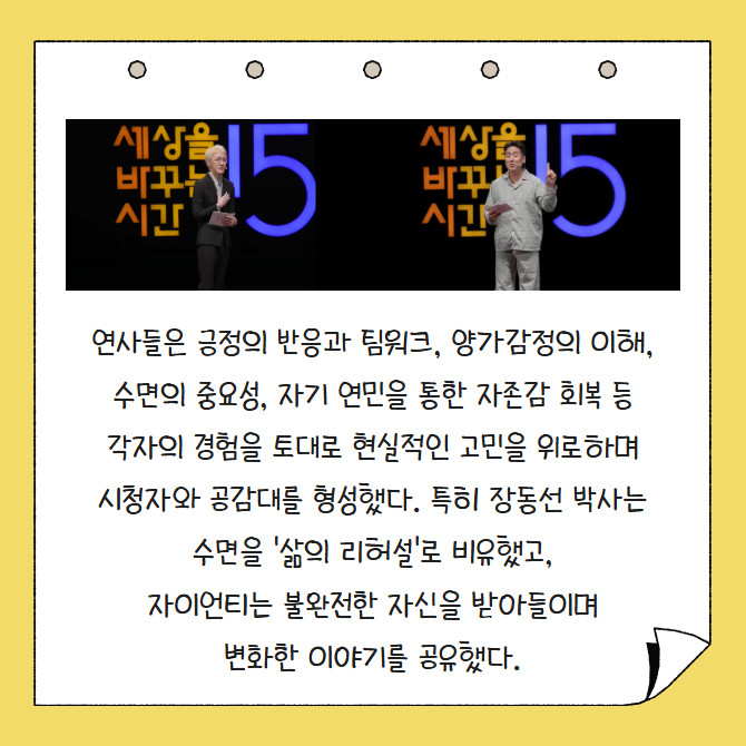 [프라임경제] 시몬스가 '세상을 바꾸는 시간 15분(세바시)'과 함께 '성장을 위한 아름다운 휴식'을 주제로 특별 강연을 열고 이를 담은 영상을 유튜브에 공개해, 2주 만에 누적 조회수 70만회를 기록하며 큰 관심을 받고 있다. 이번 강연에는 지휘자 백윤학, 윤홍균 정신건강의학과 전문의, 뇌과학자 장동선, 가수 자이언티가 참여해 바쁜 일상 속 휴식과 성장의 가치를 전했다.