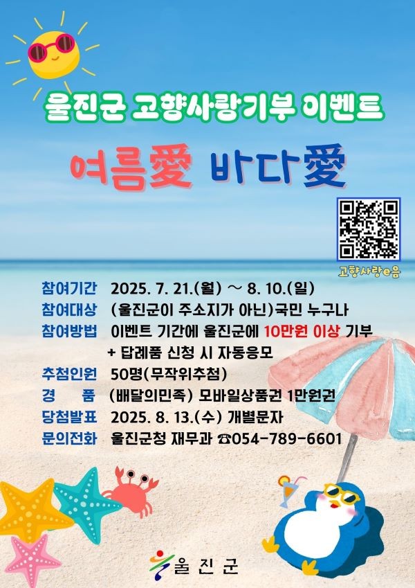 [프라임경제] 울진군(군수 손병복)은 여름 휴가철을 맞아 고향사랑기부제 '여름愛 바다愛'이벤트를 8월10일까지 시행한다.