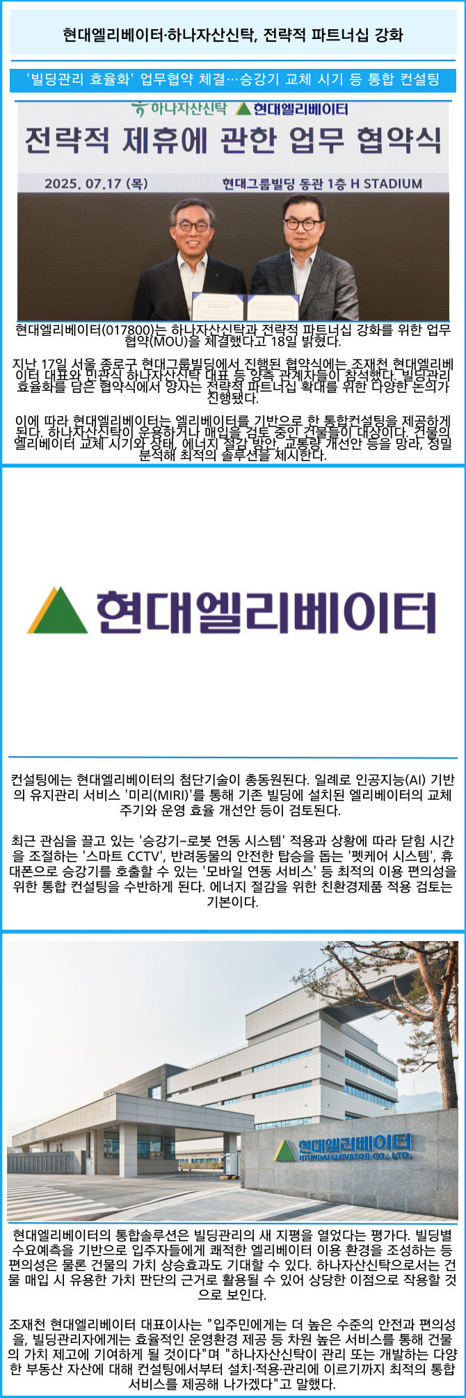 [프라임경제] 현대엘리베이터(017800)는 하나자산신탁과 전략적 파트너십 강화를 위한 업무협약(MOU)을 체결했다고 18일 밝혔다.