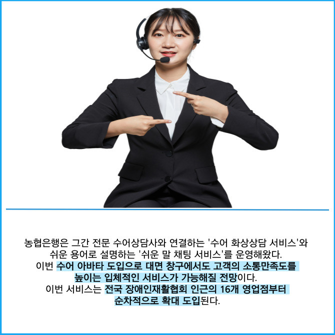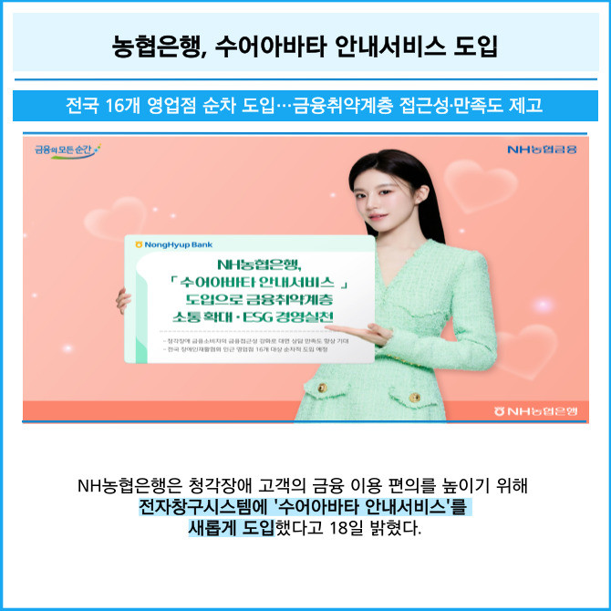 [프라임경제] NH농협은행은 청각장애 고객의 금융 이용 편의를 높이기 위해 전자창구시스템에 '수어아바타 안내서비스'를 새롭게 도입했다고 18일 밝혔다.