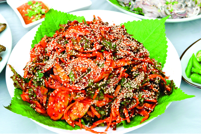 무와 당근·양파·오이 등과 만난 전어는 마치 활화산을 연상시키는 전어회로 탄생했다. 빨간색으로 버무려진 회무침은 보는 것만으로도 입안에 침이 가득 고인다. 상추 또는 깻잎에 싸서 입에 넣으면 시큼한 장맛과 신선하고 아삭한 야채맛이 어우러져 새콤하면서도 시원한 맛에 힐링을 느끼게 된다.