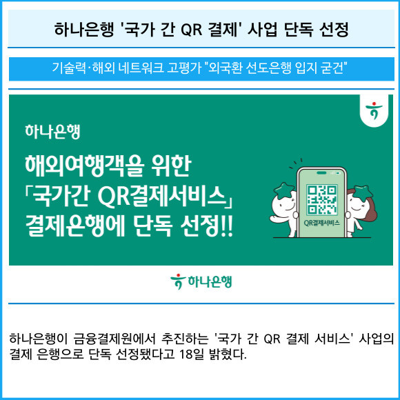 [프라임경제] 하나은행이 금융결제원에서 추진하는 '국가 간 QR 결제 서비스' 사업의 결제 은행으로 단독 선정됐다고 18일 밝혔다.