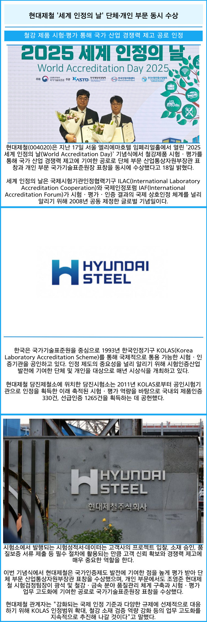 [프라임경제] 현대제철(004020)은 지난 17일 서울 엘리에마호텔 임페리얼홀에서 열린 '2025 세계 인정의 날(World Accreditation Day)' 기념식에서 철강제품 시험‧평가를 통해 국가 산업 경쟁력 제고에 기여한 공로로 단체 부문 산업통상자원부장관 표창과 개인 부문 국가기술표준원장 표창을 동시에 수상했다고 18일 밝혔다.